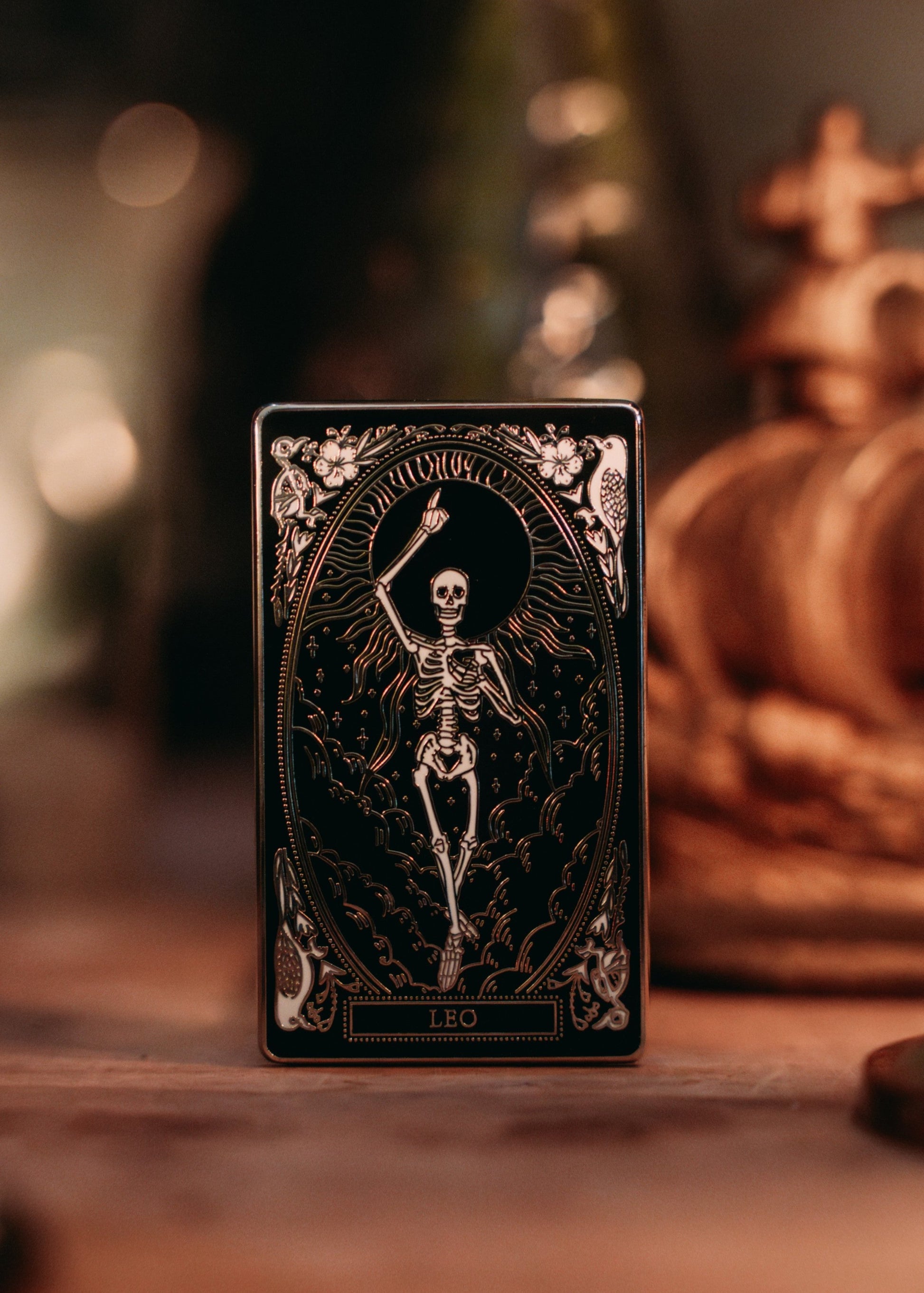 Channel the bold, fiery spirit of Leo with this striking hard enamel pin, featuring the Leo oracle card from The Mirror Oracle deck. Symbolizing strength, confidence, and creativity, this pin celebrates Leo’s radiant energy and natural leadership.