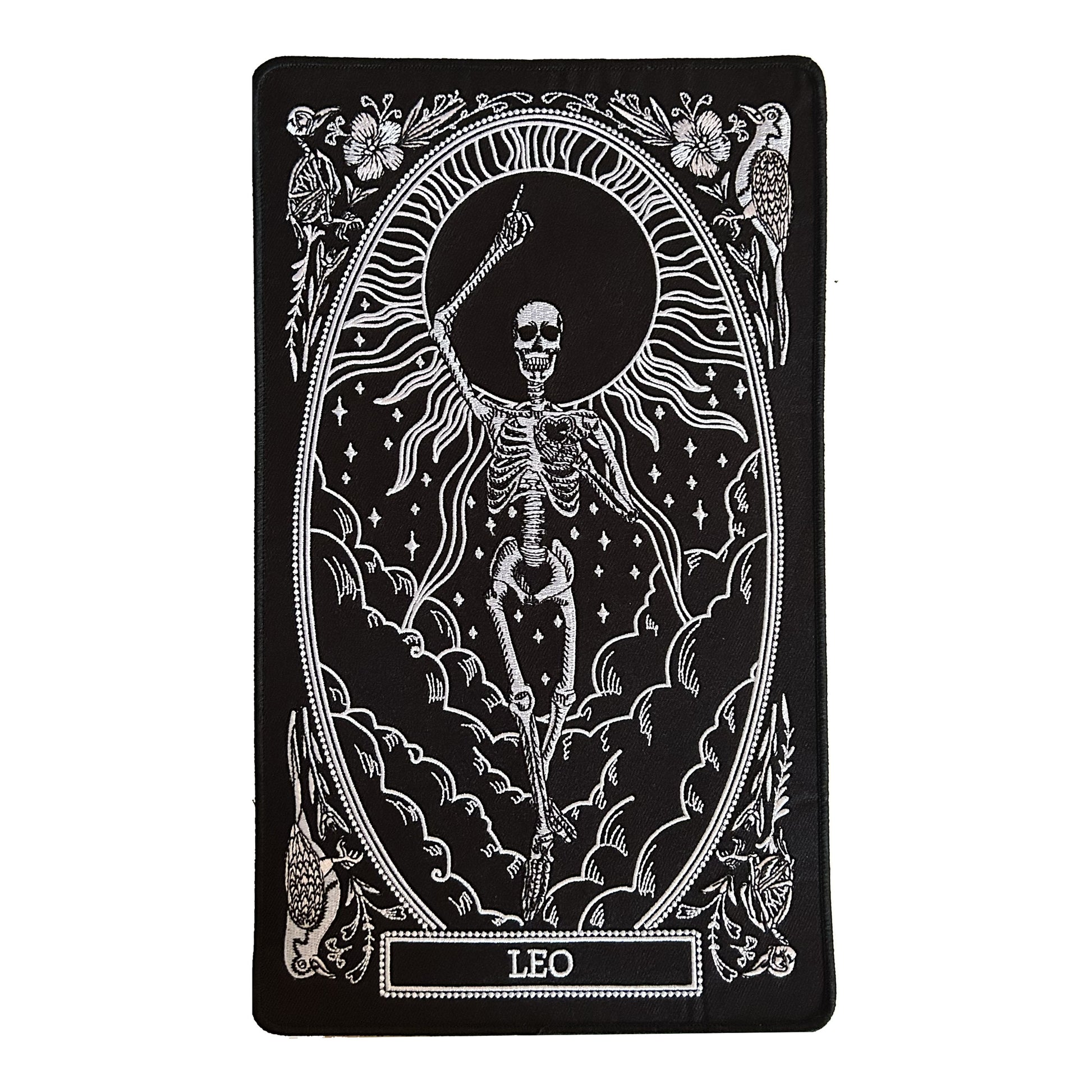 Harness the bold, radiant energy of Leo with this stunning 7" wide by 12" high embroidered back patch, featuring the Leo oracle card from The Mirror Oracle deck. Crafted in white thread and finished with an iron-on adhesive, this patch embodies the fiery strength, courage, and charisma of Leo.