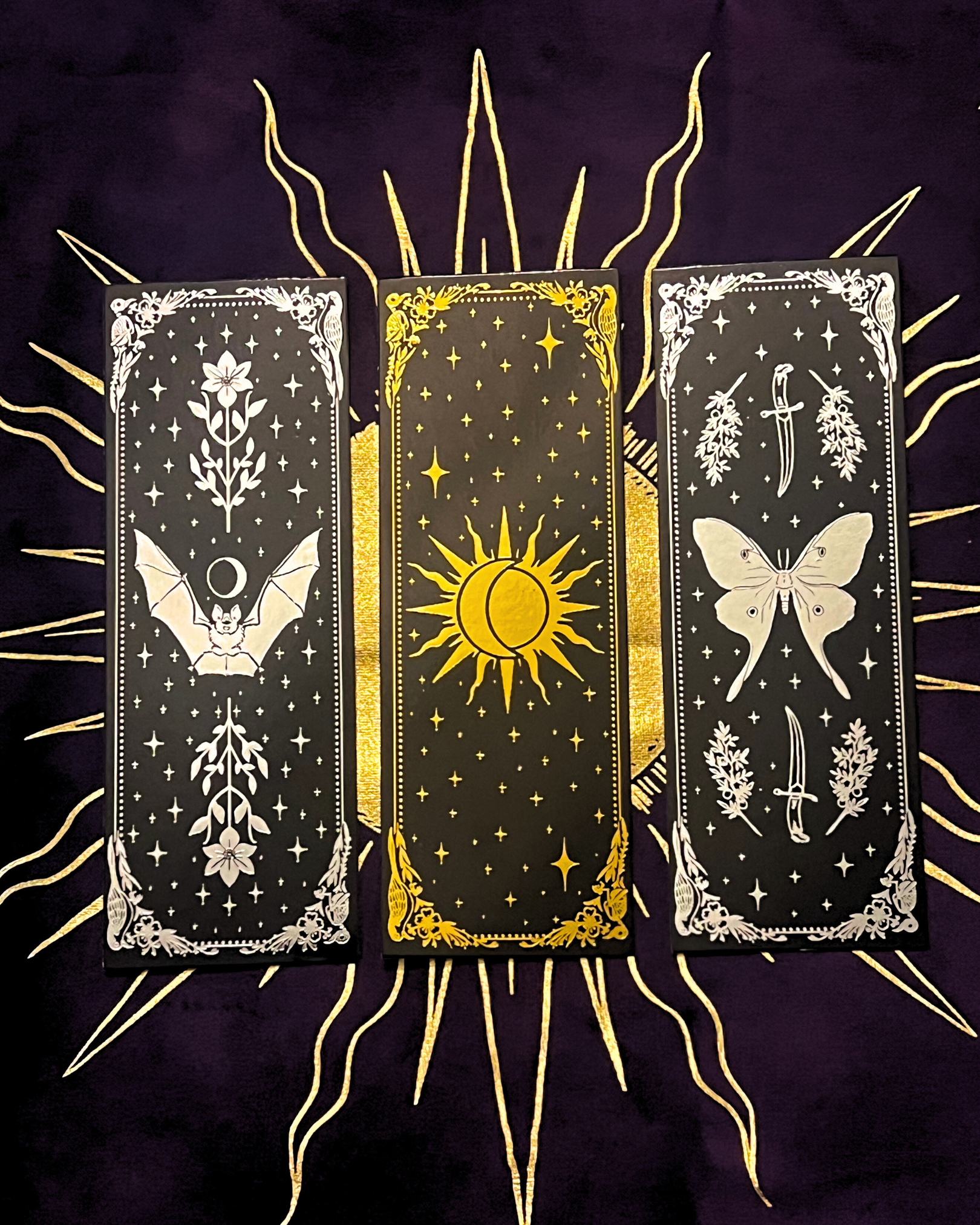 A set of three foil-printed paper bookmarks featuring celestial imagery from the Mirror Oracle and Marigold Tarot by Amrit Brar.