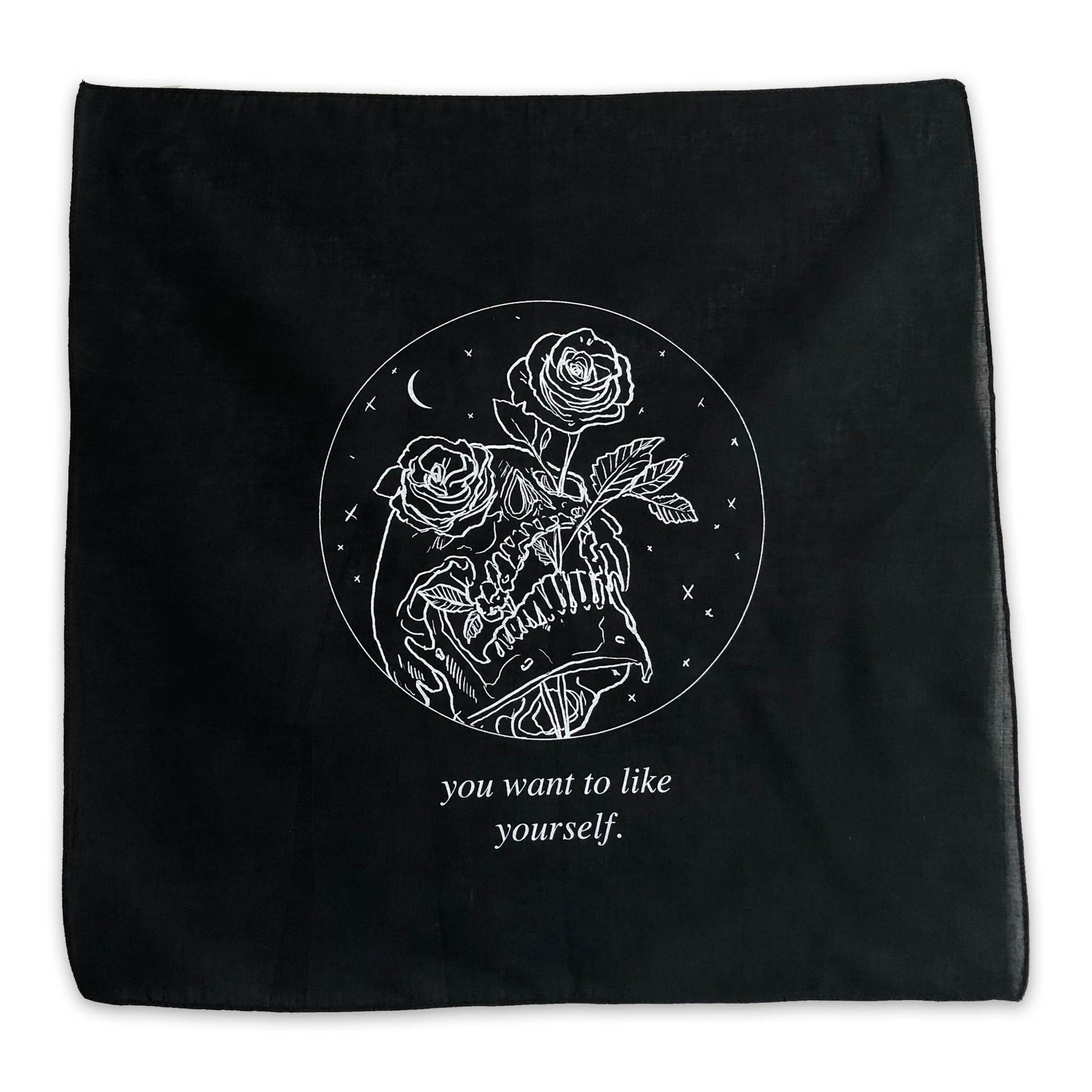 Screenprinted artwork on a 100% cotton bandana that reads "you want to like yourself" in white ink.